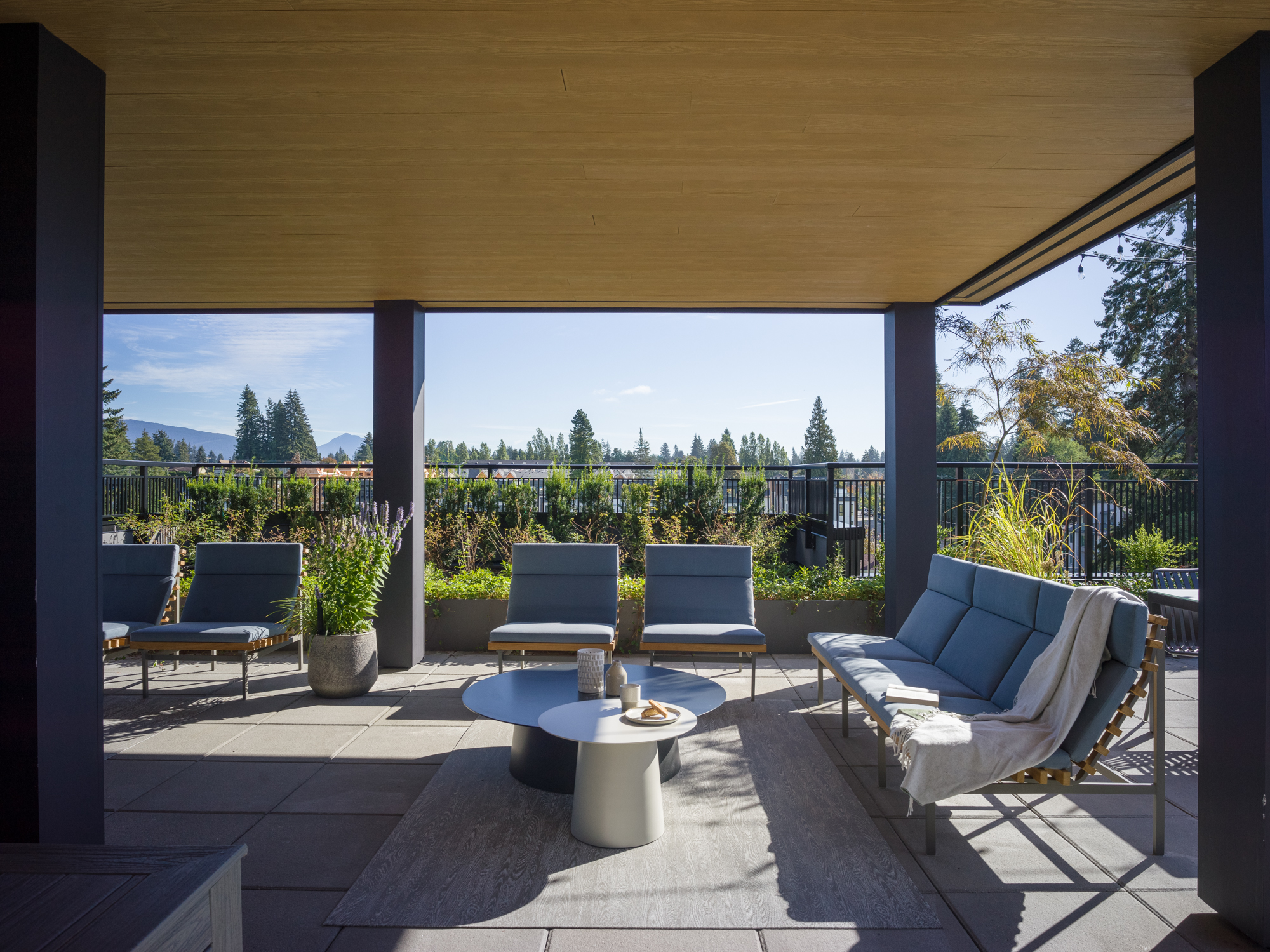 Discover modern living at 710 Dogwood with a range of amenities designed for your comfort and enjoyment. As you enter the front lobby, you are connected to an amenity lounge that provides space for flexible use and community connection. As an extension of the indoor social space, an adjacent outdoor area includes a children’s playground with adventure play elements surrounded by integrated lounge seating. Upstairs, residents will enjoy stunning views of the mountains on the rooftop patio.