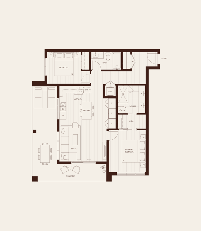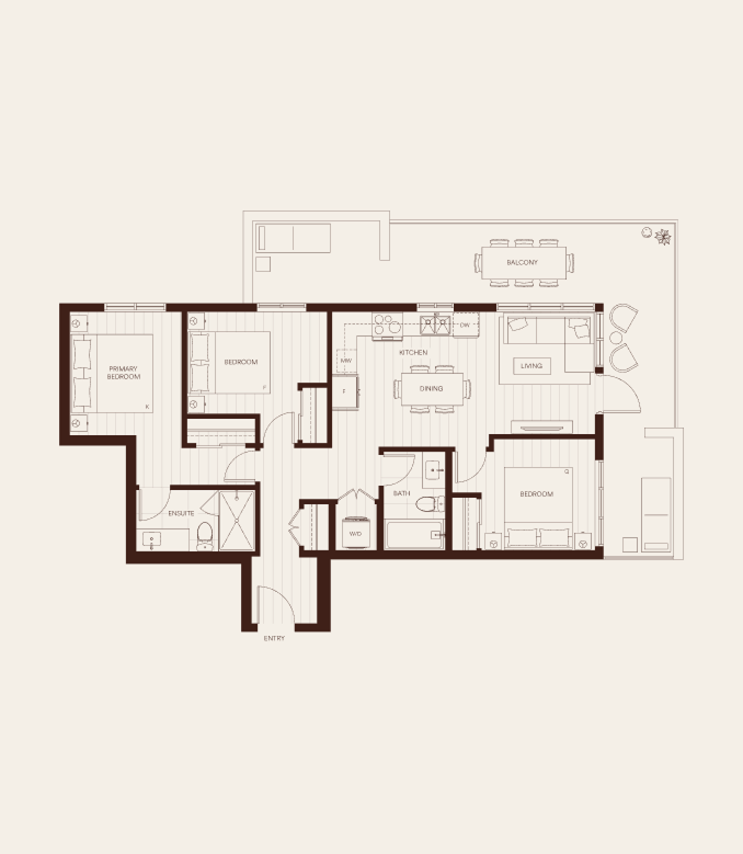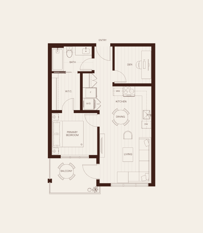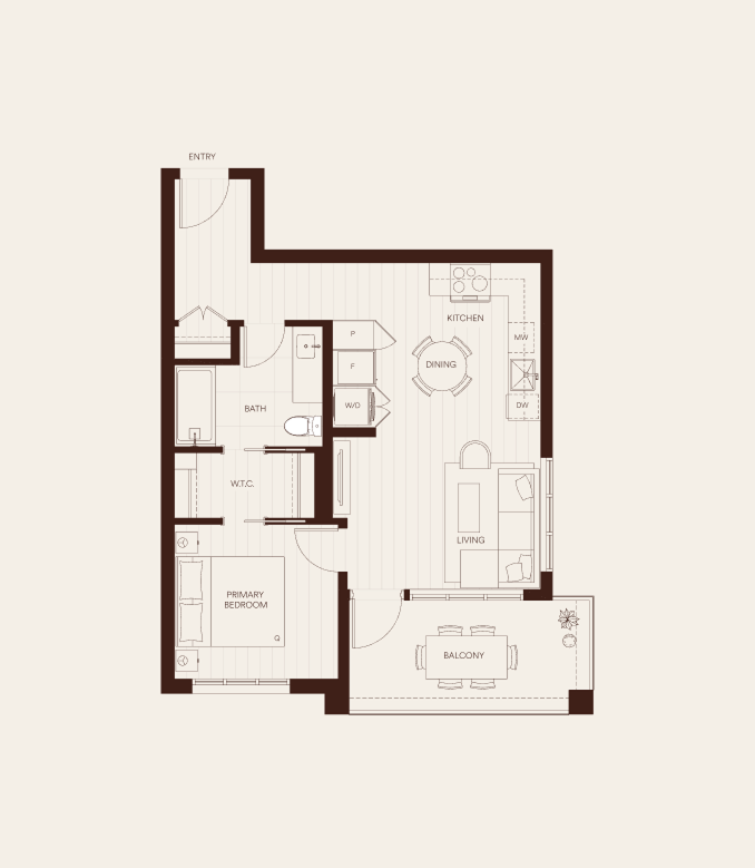 Bring in your furniture, decor, and personal touches to make your space truly yours. Suites come with a fully-equipped kitchen, in-suite washer and dryer, closet organization, and for many, a private outdoor balcony. Thoughtfully designed and high quality fixtures and finishes provides a bright, modern aesthetic for your new home.